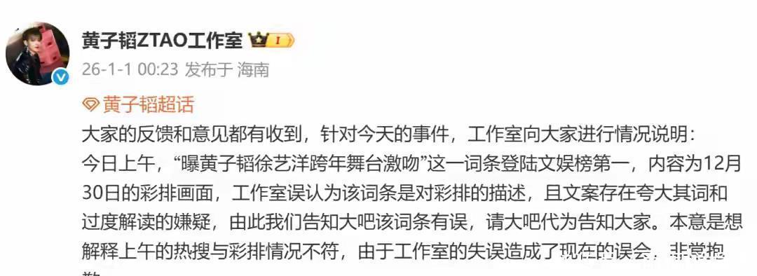 黄子韬徐艺洋跨年舞台激吻?黄子韬工作室道歉!对不起,是我夸大了!舞台上飘落的白纱、深情对望的眼神,加上恰到好处的错位拍摄,一场精心设计的跨年合唱被传成了“激吻”现场,工作室的道歉声明反而火上浇油。