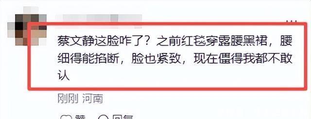 网友看着都忍不住的调侃道: “蔡文静这脸咋了?之前红毯穿露腰黑裙,腰细得能掐断,脸也紧致,现在僵得我都不敢认。”