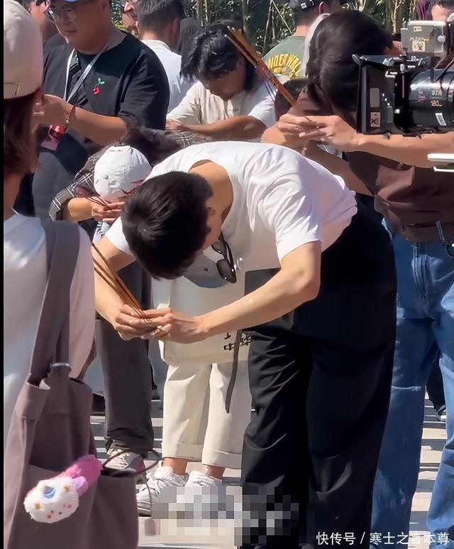 参加开机仪式格外的用心。 手里拿着香特别的虔诚,别人是正常弯腰,他都快90度了。